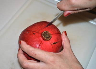 First I begin to make a slit down the side of the pomegranate