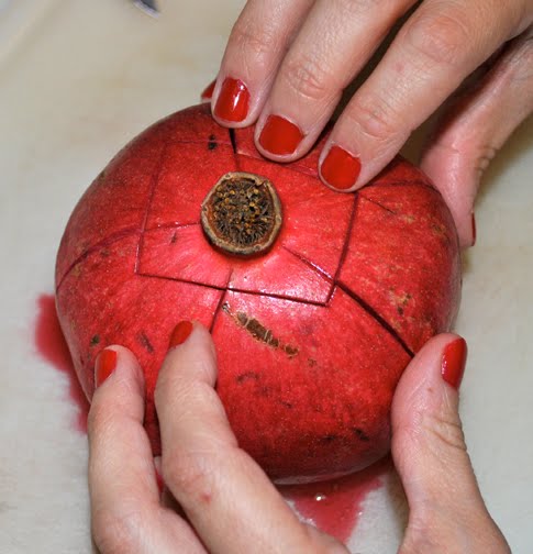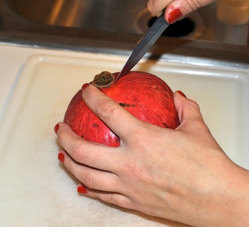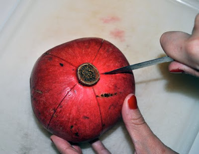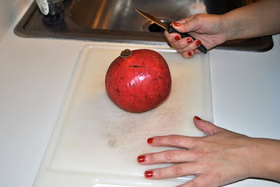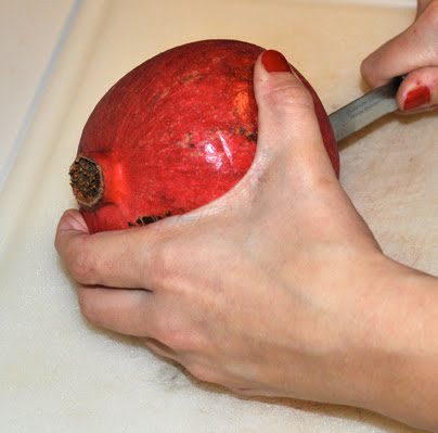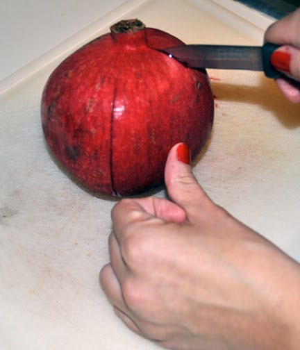 First I begin to make a slit down the side of the pomegranate