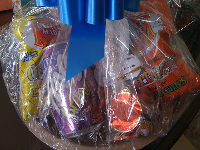 Chocoholic Basket: hot chocolate mix, chocolate cookies, chocolate ice cream topping, chocolate candies.