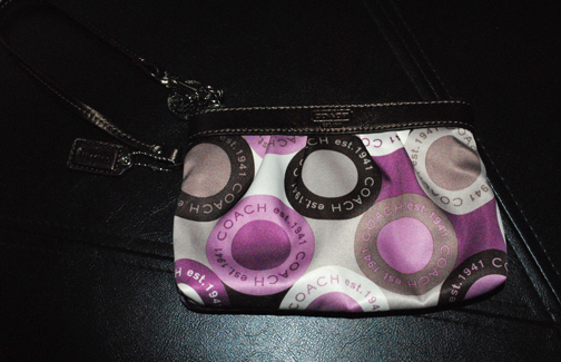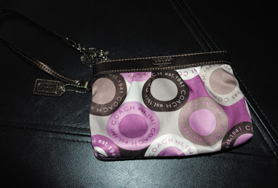 a super cute Coach wristlet! It\’s brown, pink and purple and would be great addition to any holiday outfit!