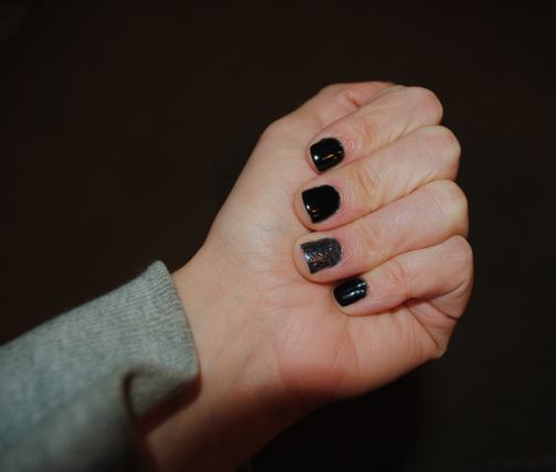 {Current Nails: OPI Black Onyx with Nicole by OPI Follow Me On The Glitter accent}