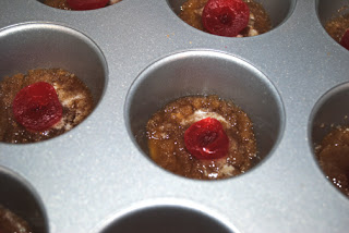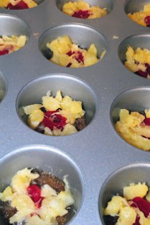 6. Place a half maraschino cherry in the middle of each cupcake and cover completely with crushed pineapple. Repeat in all cups.