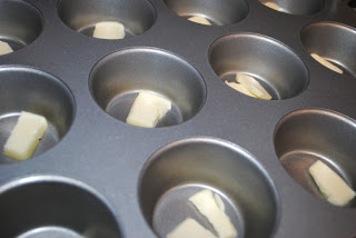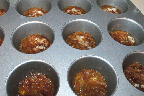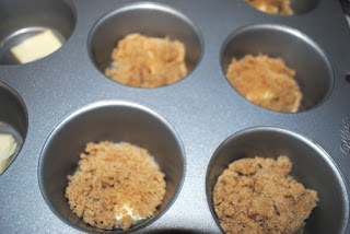 4. Place a little over one teaspoon to a little under one tablespoon of butter in each muffin cup, and then add one tablespoon of brown sugar.