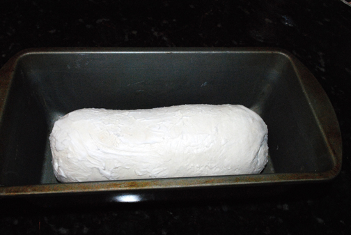 Buy a frozen loaf of bread (I bought wheat) cover it in Crisco and set on the counter. Allow to thaw and rise.