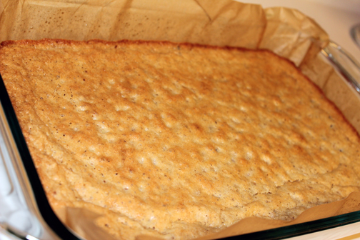 • To make the crust: combine the powered sugar, flour, salt and cubed butter, using a pastry cutter. You want to continue to combine until it resembles coarse cornmeal (as pictured above). Firmly pat the mixture into the bottom of the 9×13 baking dish. Bake the crust for 20-25 minutes, or until just lightly golden.