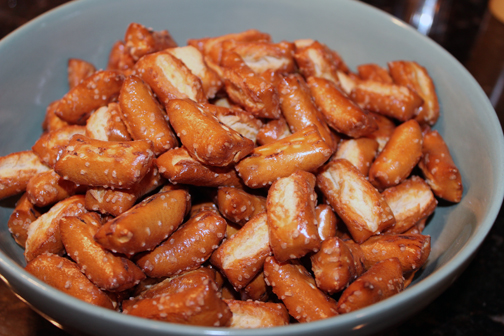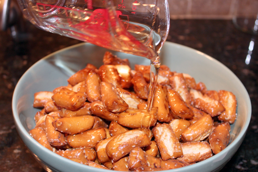 3. Pour the oil over the pretzels, and mix to coat.