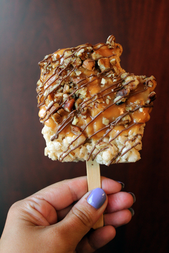 This past weekend I met up with a few girlfriends for a movie in the moonlight. We each brought a favorite childhood goodie with an adult twist to indulge in. From chocolate covered gummy bears to pineapple Panko chicken nuggets with honey dijon and everything in between we had an amazing movie night spread. I took a gourmet approach to Rice Krispie treats. I placed Rice Krispie squares onto a popsicle stick, dipped them into homemade salted caramel sauce, sprinkled on nuts and drizzled milk chocolate across the treats creating the perfect salty sweet combination.