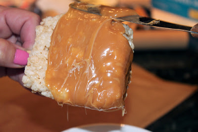 5. Spread salted caramel onto part of the treat and sprinkle with nuts. Repeat with remaining treats.