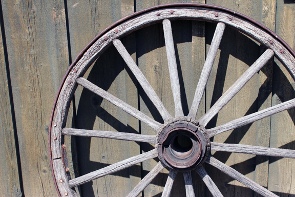{an old wagon wheel at the orchard}