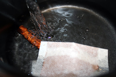 {water, mulling spice bag and cinnamon stick}