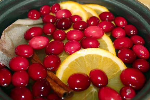 {water, mulling spice bag, cinnamon stick, cranberries and orange slices}