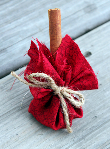 {wrap in a 6×6 inch piece of fabric adorned with twine and a cinnamon stick}