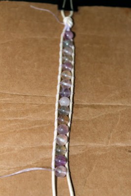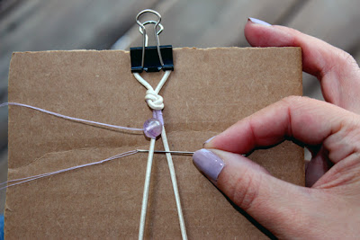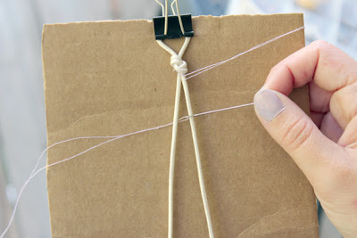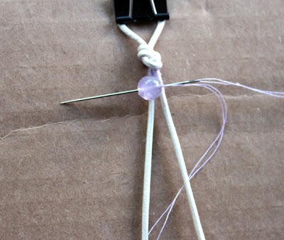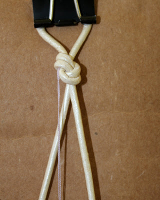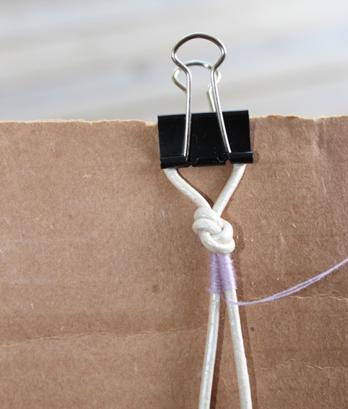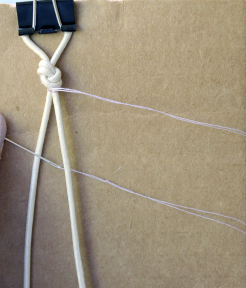 Step 2: Fold your leather cord in half. At the loop end, tie a knot about 3-4 inches from the end. Be sure your button will fit into the loop. Attached binder clips to a piece of cardboard or use a clipboard and binder clips to hold the bracelet in place. Thread your needle. I used about a yard and a half for a single wrap bracelet. If you don’t have enough you can always knot the thread and glue it. Knot your thread to your cord and bring your needle up under the right cord through the center.