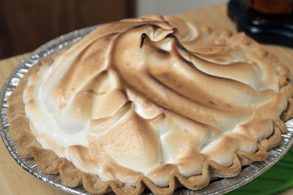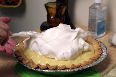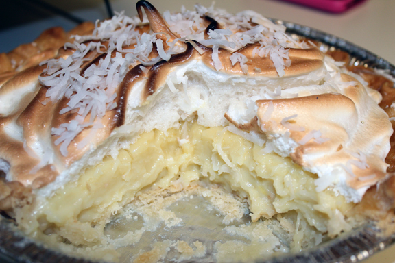 I only make pies at Thanksgiving; I have always found them to be more of a hassle and would prefer to make cookies or cake over pie when I have guest over. That was until my neighbor Barb invited me over for the day to learn how to make a coconut cream pie. We used this recipe, and instead of struggling making the crust we used a Pillsbury one that comes in a red box and is found in the refrigerator section at the grocery store.  She also taught me that unless you are baking your pie with the filling in it you need to pierce the crust with a fork on the bottom and sides to make sure it does not bubble up. Here is a peak at our coconut cream pie.
