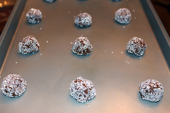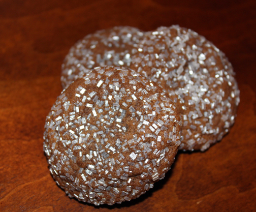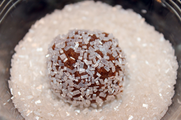 3. Roll into ½ teaspoon or 1 tablespoon balls. Roll in pearlized sugar and place on a cookie sheet. Slightly flatten each ball with the bottom of a glass. Bake 8-12 minutes. Transfer to wire racks and allow to cool.