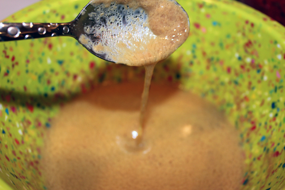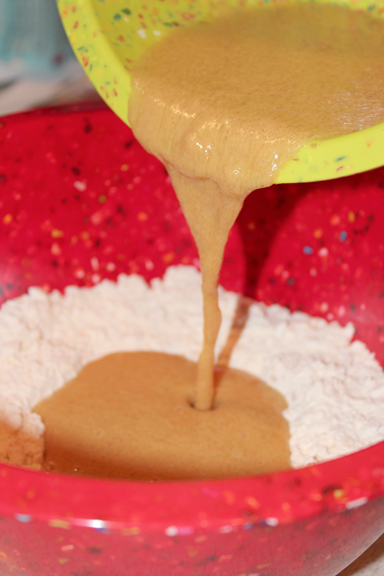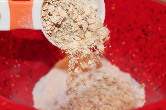 3. In a large bowl whisk together the flour, cornmeal and oats. Make a well in the center of the flour mixture and pour in the wet ingredients. Stir well to combine.
