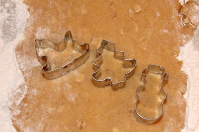4. On a well-floured surface roll the dough out to about 1/3 of an inch thickness. Using a cookie cutter cut out the treats and transfer to a baking sheet.