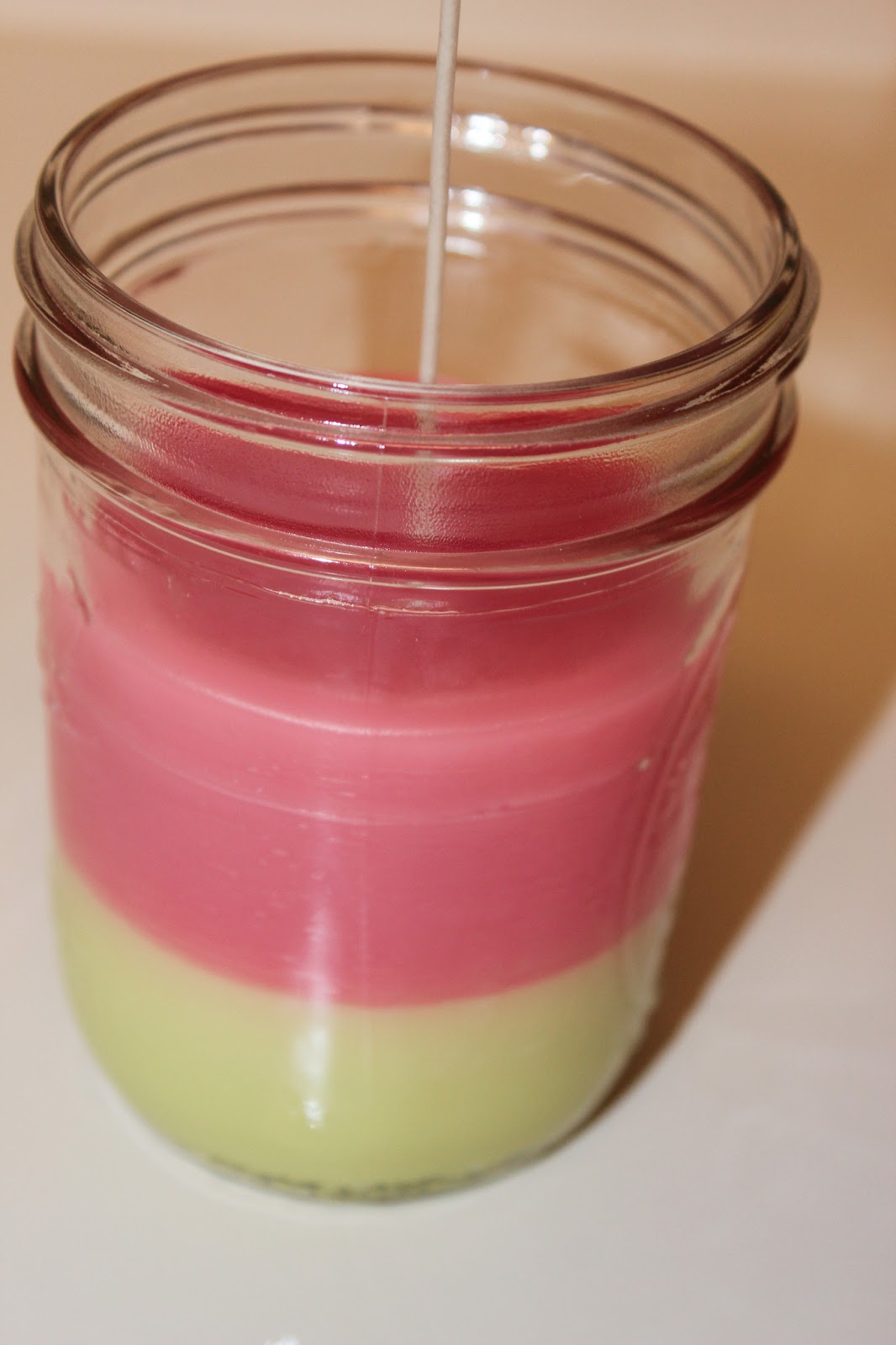 Around Christmas time I showed you how to make this candle using left over candle wax. Another simple way to use left over wax is by creating a layered candle. For the candle below I used left over wax from the following brands: Yankee Candle, Slatkin & Co. and Kohls. The wax was placed in a mason jar (you can use whatever you’d like). IMPORTANT: Be sure to allow the wax to cool completely between layers.
