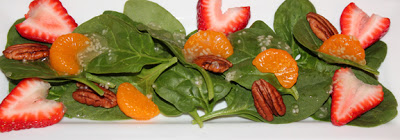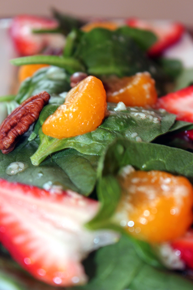 During the cooler months I am more inclined to gravitate towards comfort foods, instead of produce. I find winters produce to not only be pricy, but on the bland side. Now that spring has arrived (it was 57 yesterday) I am back on my salad kick. One of my favorite salads to make is my mum’s springtime salad. A bed of spinach leaves blanketed with mandarin oranges, strawberries and pecans topped with a homemade sweet and savory sesame dressing.