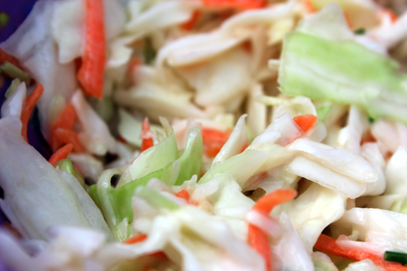 Step 3: Make coleslaw: cabbage, carrots, mayo, vinegar, sugar and chive.