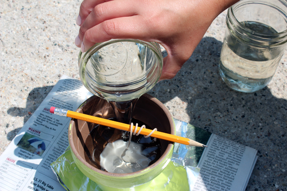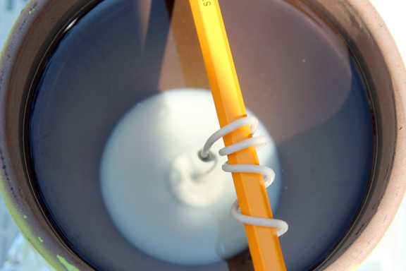 Step 3: Place a piece of foil under the pot, wrap the wick around a pencil and pour in a small amount of wax to lock your wick in place.