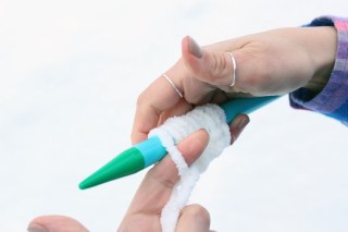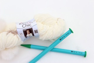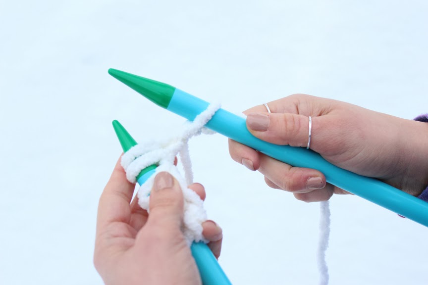 2. Knit until you have completed both skeins and 12 inches of yarn remains.
