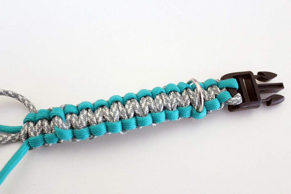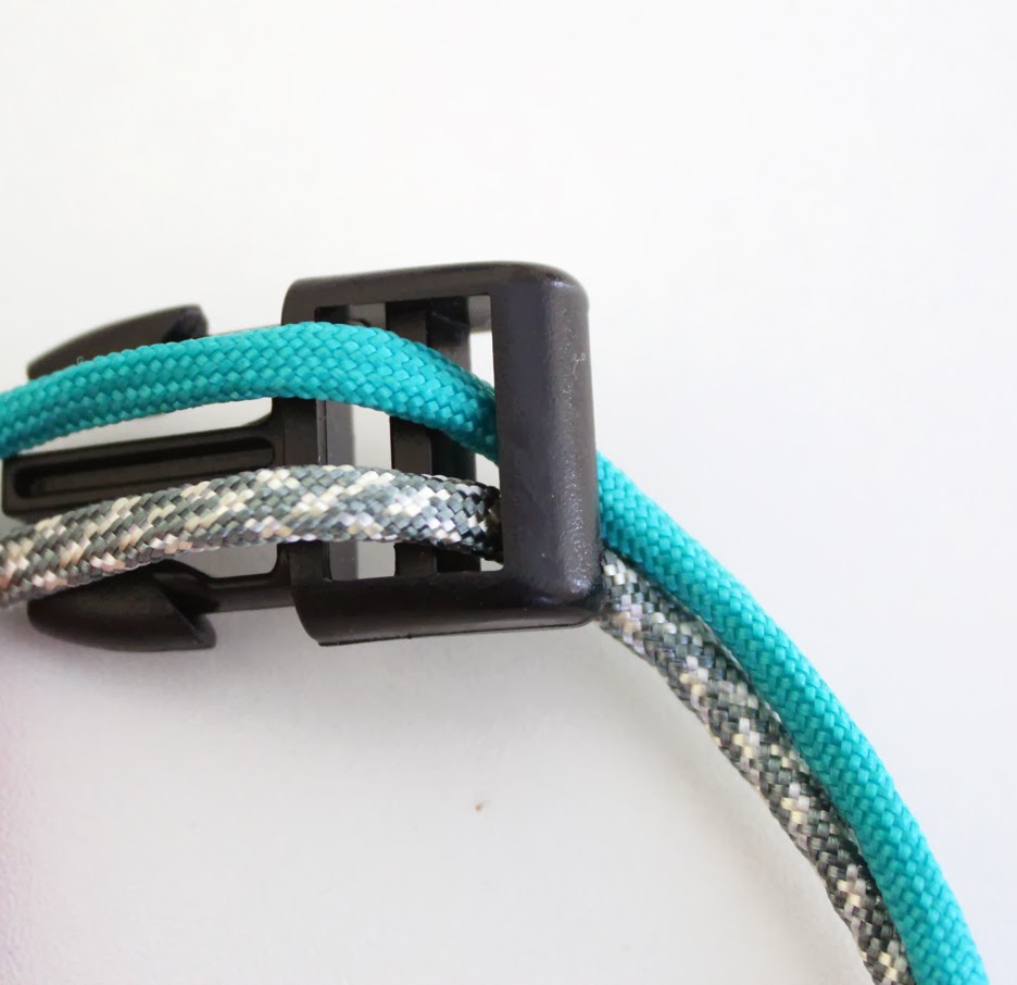 Step 4: Add your D ring (see figure 1 below of how this will end up looking). Now slide both ends of the cord through the other end of the buckle. Slide the buckle up to the length the collar needs to be (ex. Jack is 8.5 inches of cord between each cord).