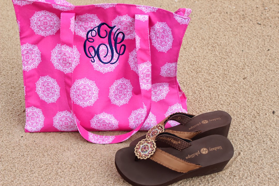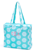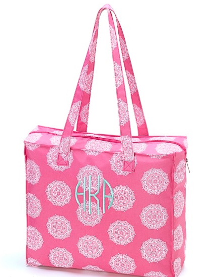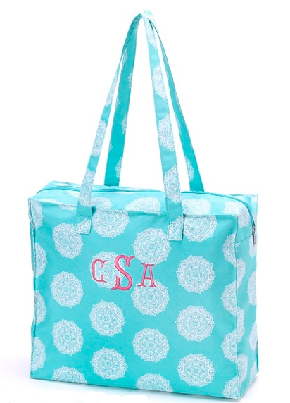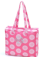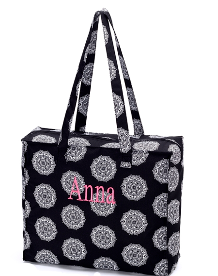 black, has a zipper closure and comes monogrammed. Making it the perfect everyday tote for the office or the beach.