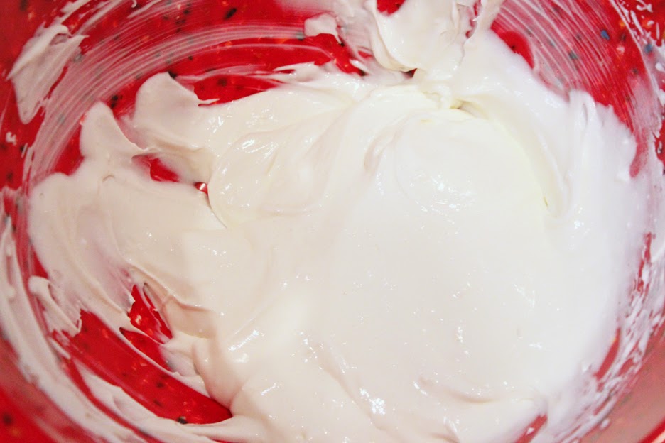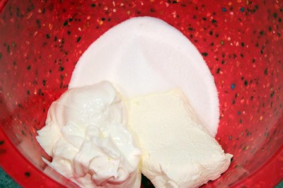 2. In a large bowl, mix together cream cheese, sour cream, white sugar and vanilla.