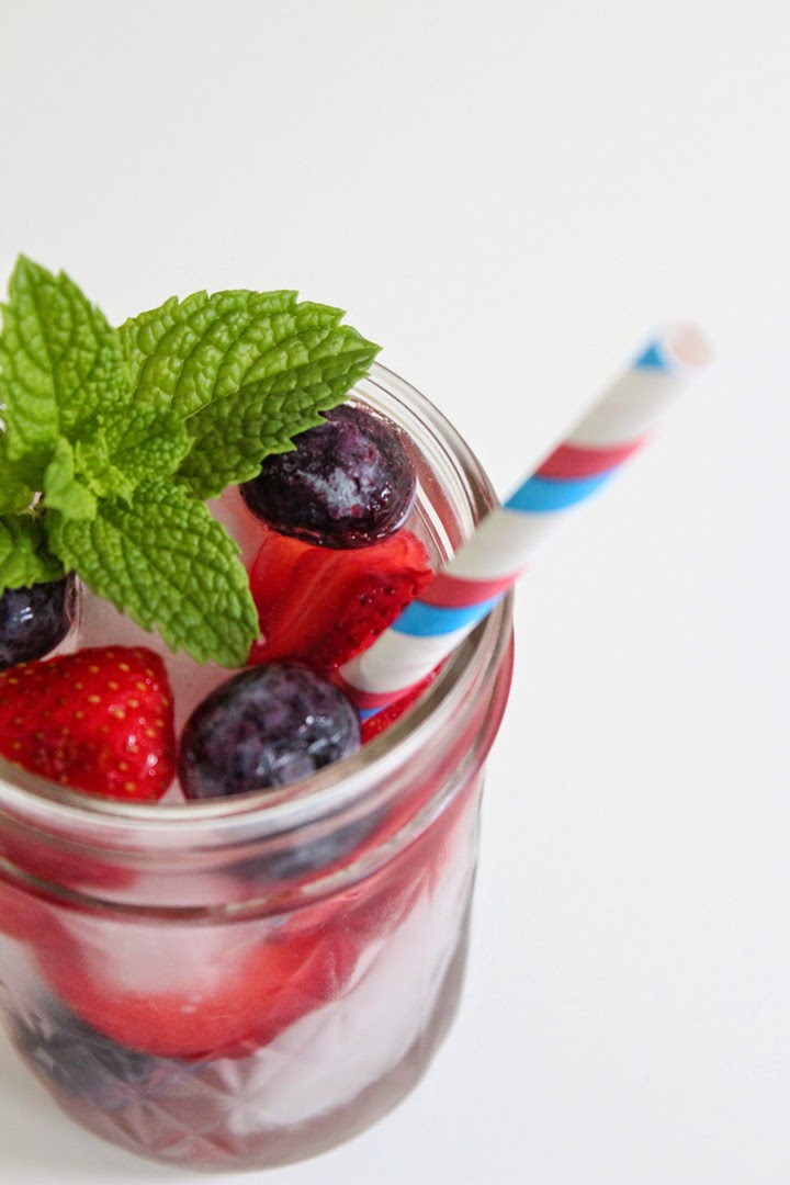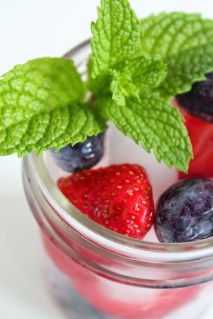 For the kids and I (virgin recipe): Squeeze some lemon into your mineral water. Next add blueberries and strawberries. Allow to marry for at least two hours. Serve over ice and garnish with a mint leave.
