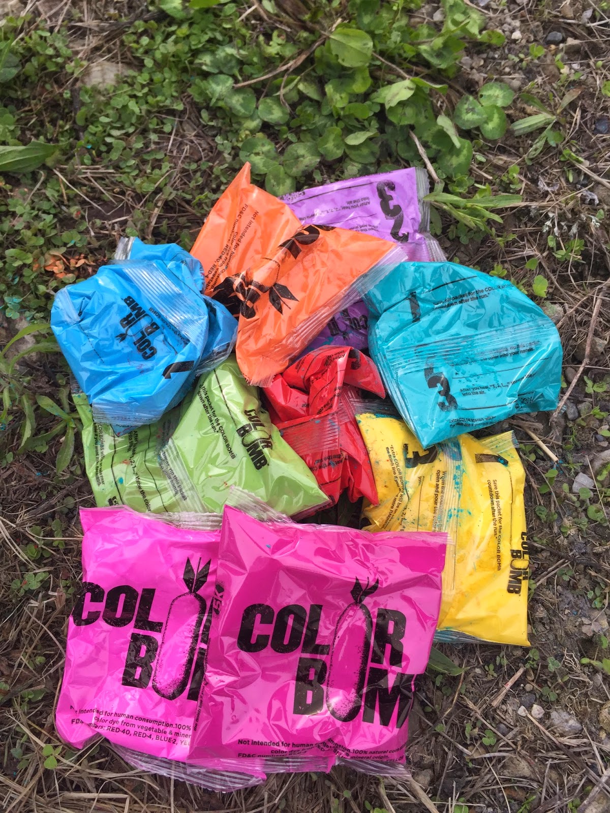 The “swag bags” contained a complimentary race shirt, number, safety pins, temporary tattoos and high socks. We came dressed in white so we would absorb the most amount of color as possible. We even bought color packets to “bomb” each other with before the race so we’d be decked out in color for pictures.
