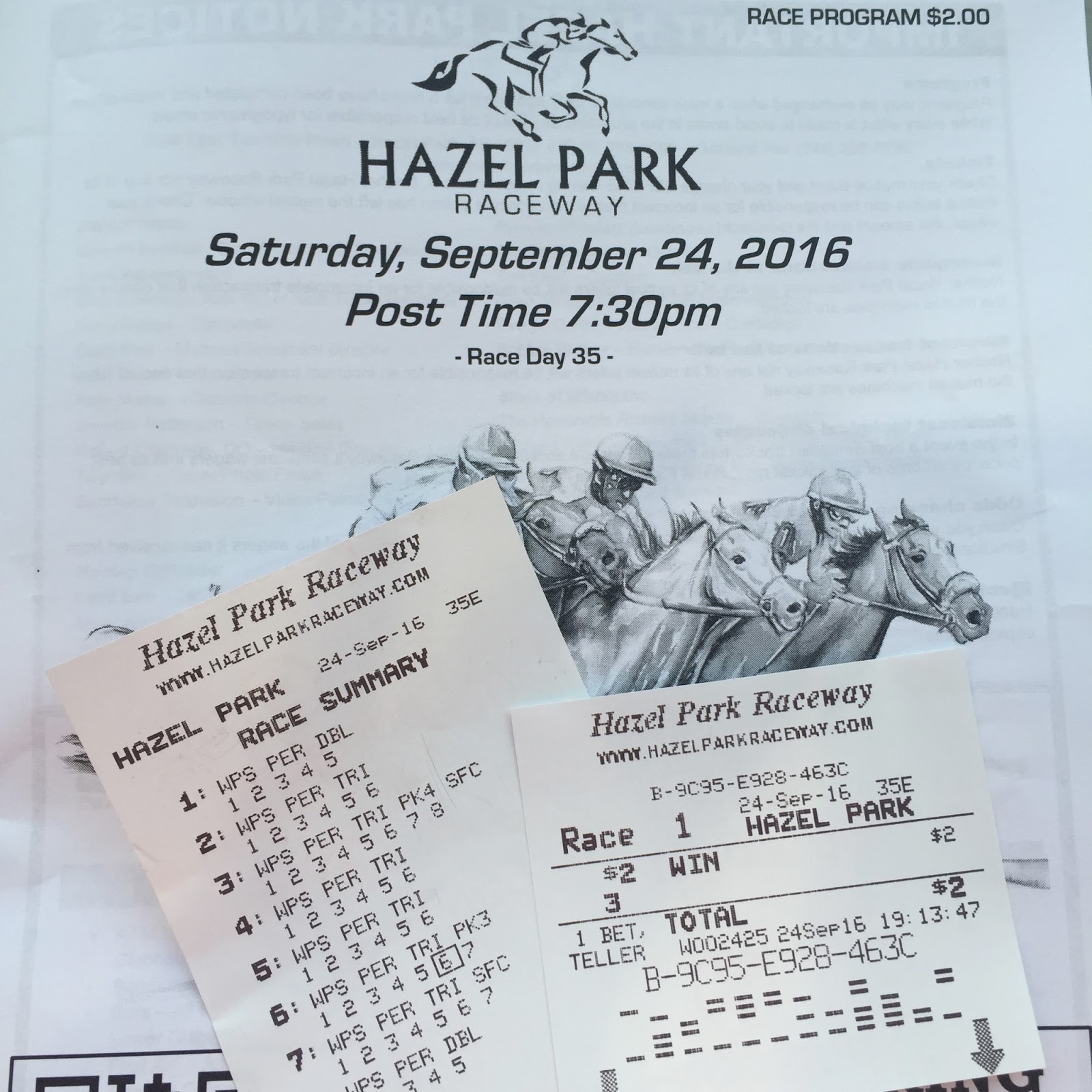 Place your bets! I recently ran a 5k at the Hazel Park Raceway, which of course led me to wanting to go watch a horse race. Since temperatures are dipping low this is the last weekend for the raceway, therefore I made sure I went this past weekend to bet on the ponies. Since this was my first time EVER at a horse race, and betting on the ponies, here are some things I learned: