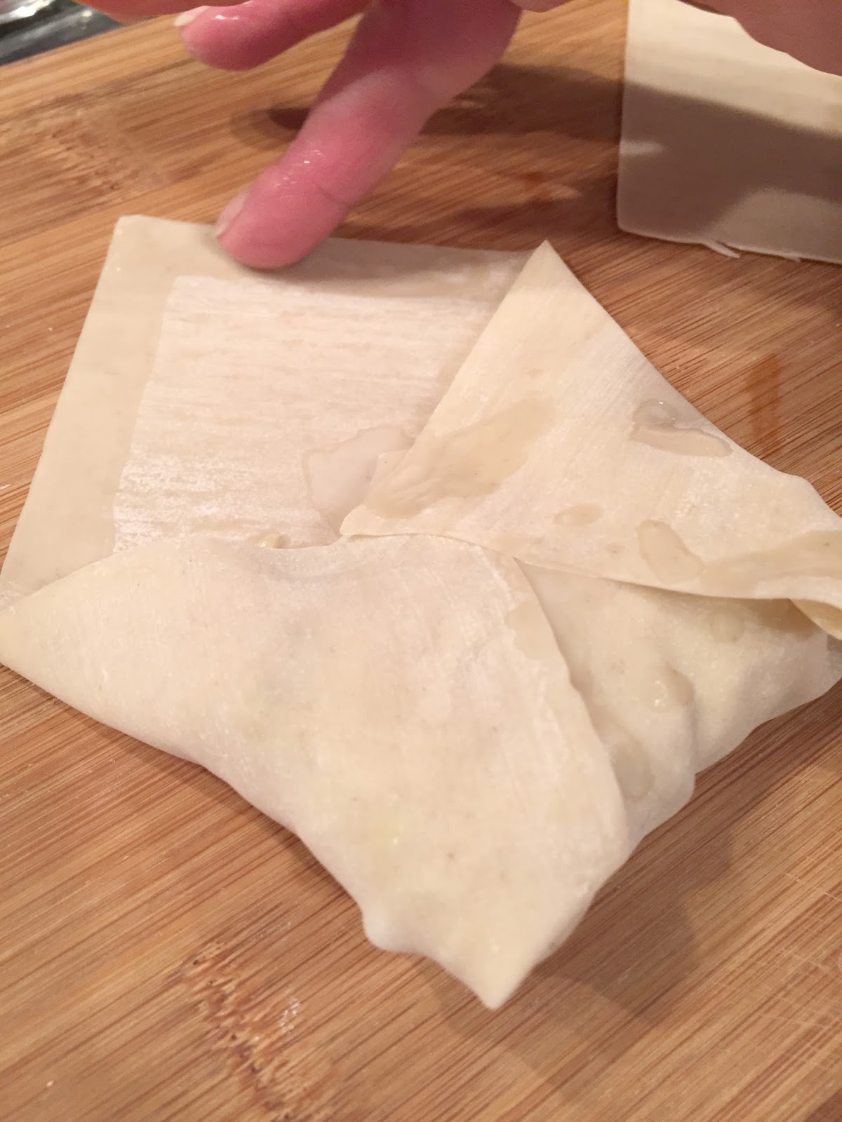 10. Fold one corner of egg roll skin over filling.