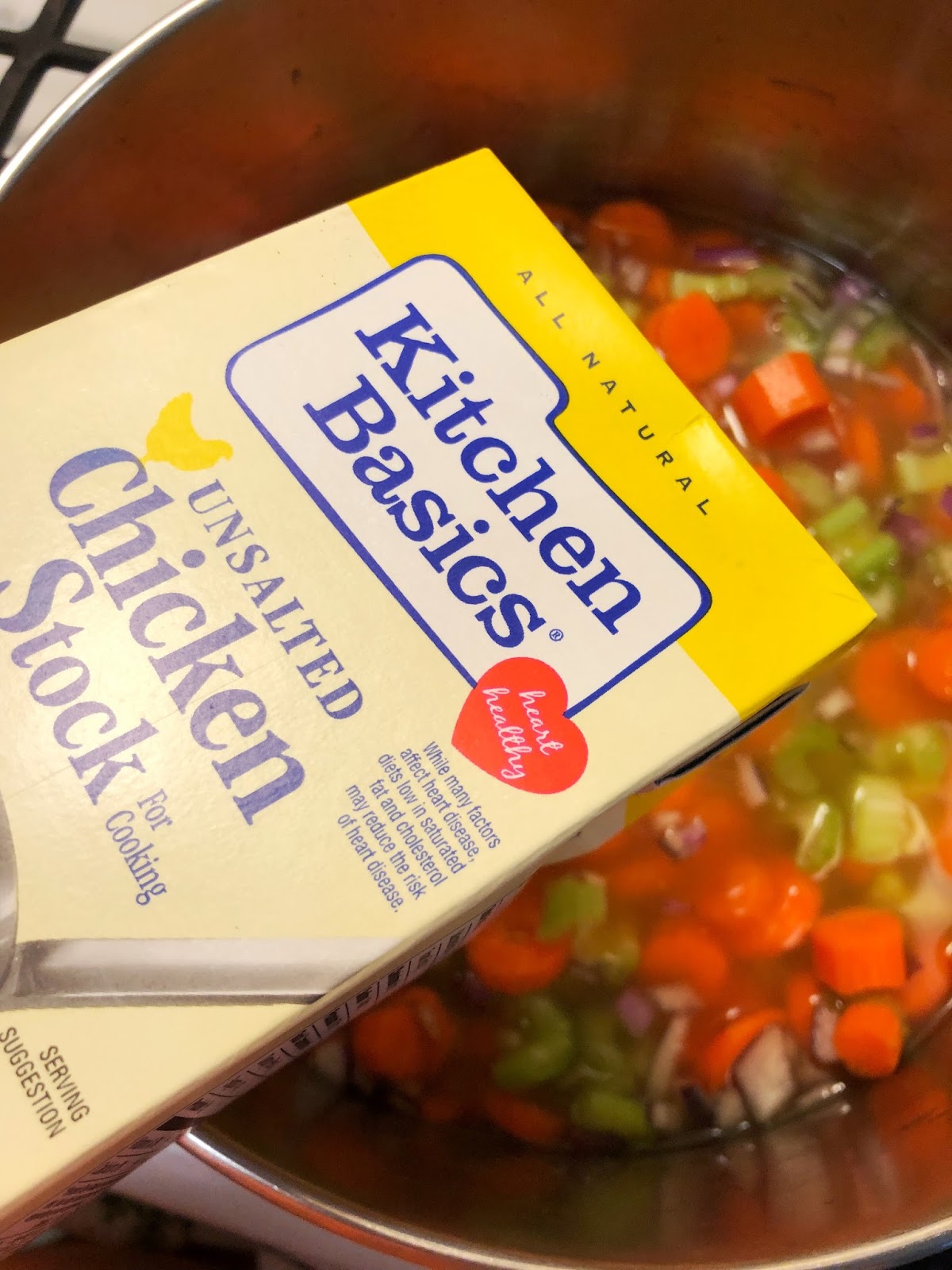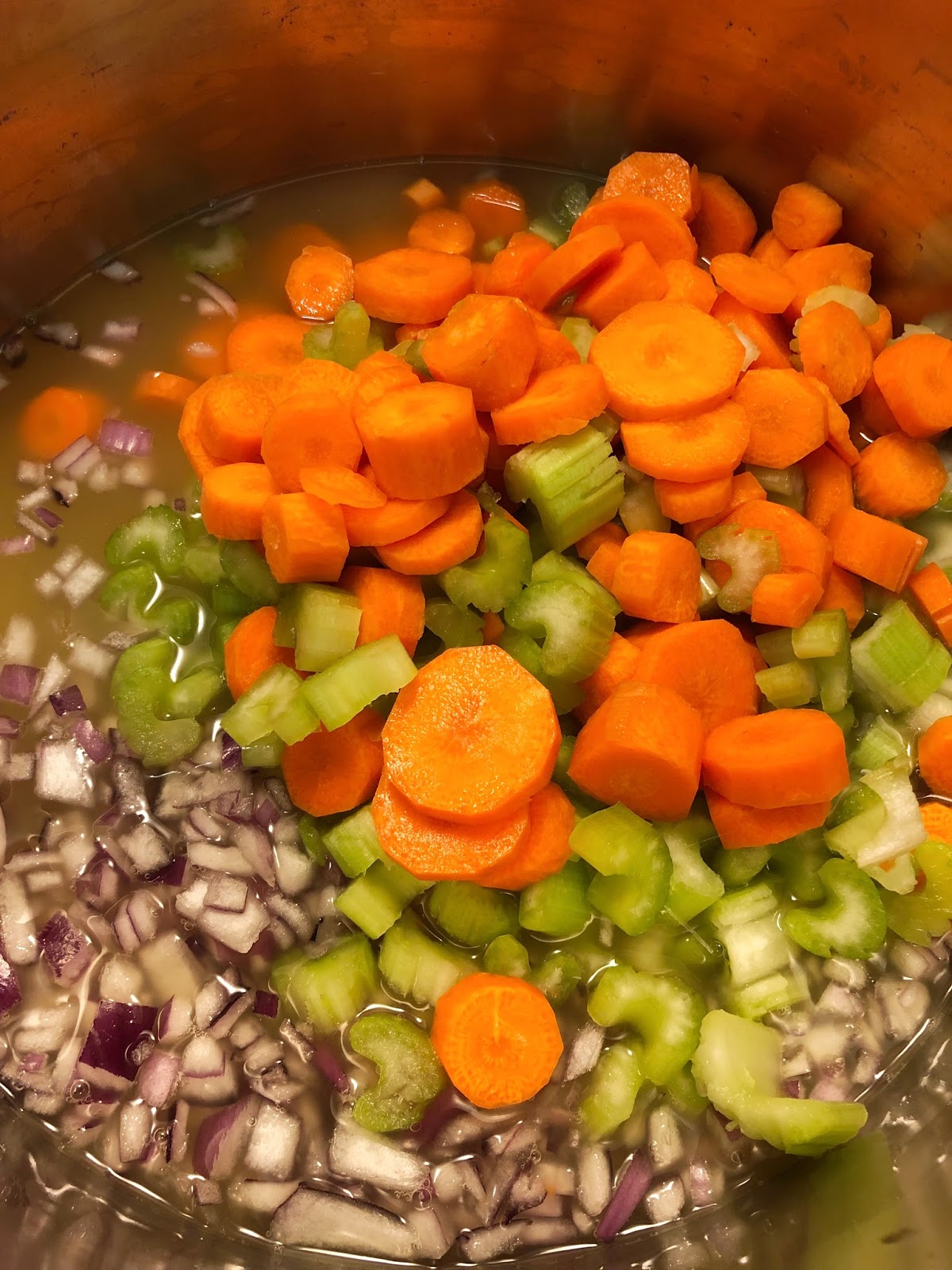 1. Add carrots, celery, onion and bay leaves to a large pot.