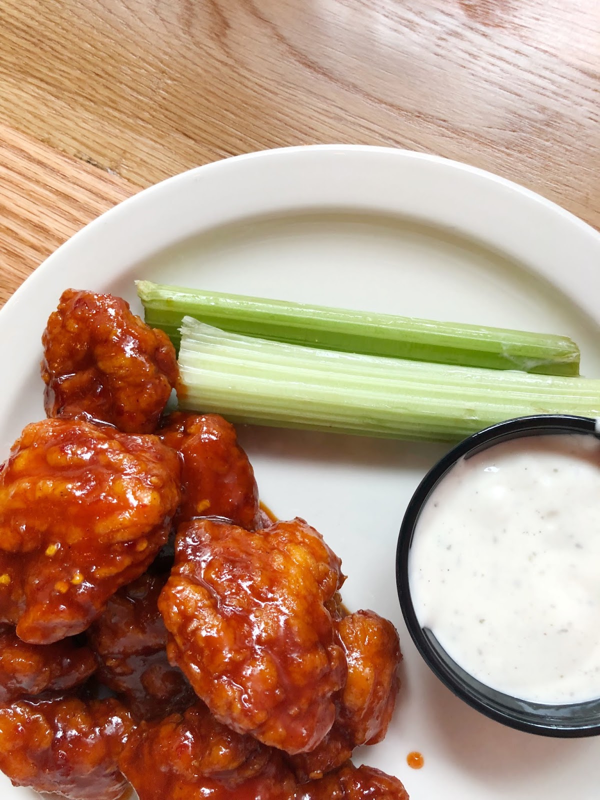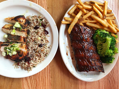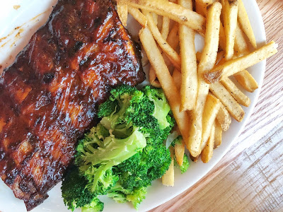 He ordered a Half Rack of Double-Glazed Baby Back Ribs. Slow-cooked to fall-off-the-bone tenderness and slathered in your choice of Spicy Texas BBQ sauce or Honey BBQ sauce (he went with spicy Texas). The verdict, these ribs were really good and did fall off the bone.