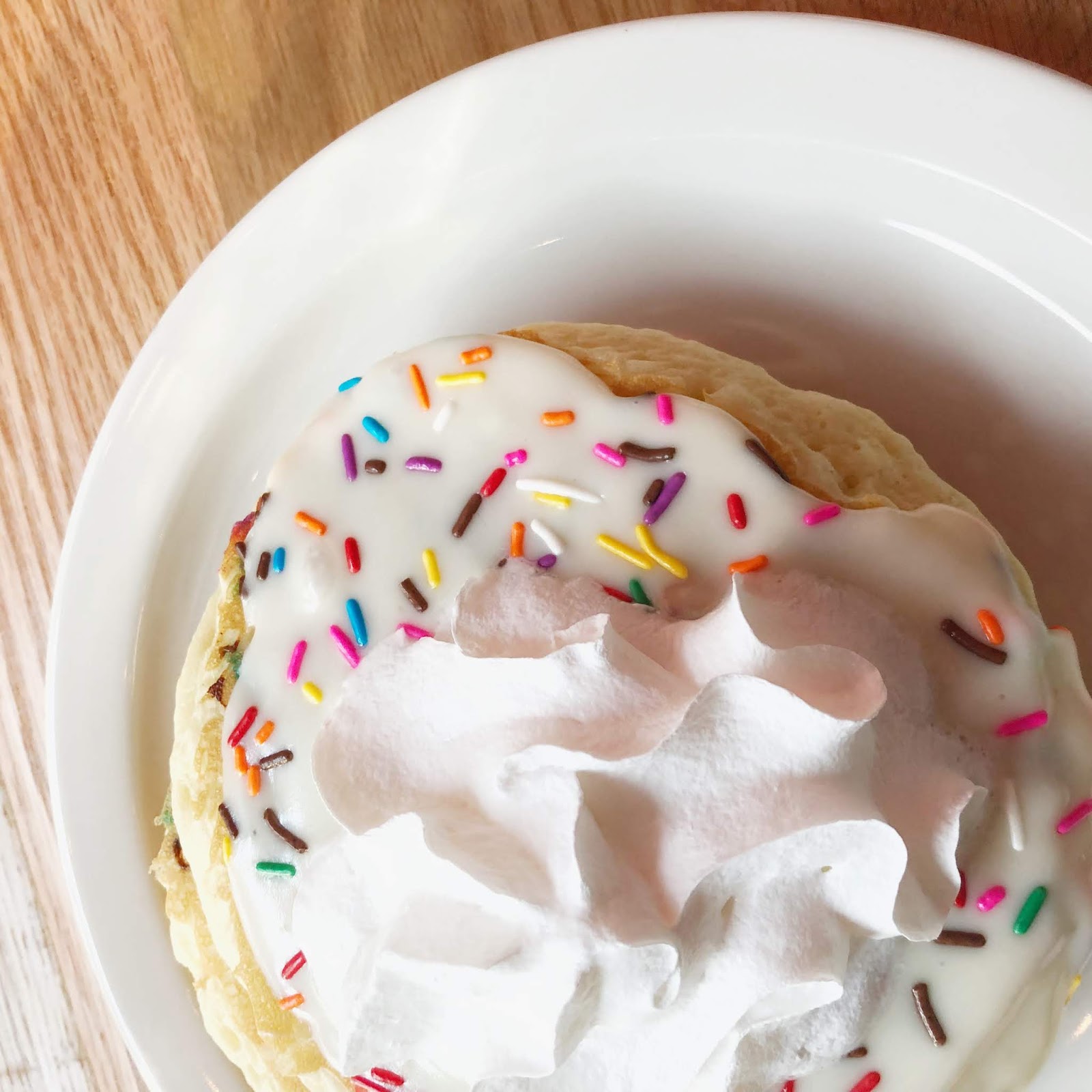 One thing I really like about A is he always wants dessert, and even if he doesn’t he can be talked into it. One thing we have in common is we both have a thing for sprinkles (obv I do more than he does, but it works). Instead of going for a traditional dessert we took it to the next level and ordered the Cupcake Pancakes off the IHOP portion of the menu. The Cupcake Pancakes come as a stack of four buttermilk pancakes that are filled with festive rainbow sprinkles and topped with cupcake icing, more sprinkles and of course whipped cream. The pancakes tasted just like a cupcake, and while they are insanely sweet they are so good. If you are a confetti cake, sprinkles on ice cream and everywhere else lover I cannot recommend these pancakes enough.