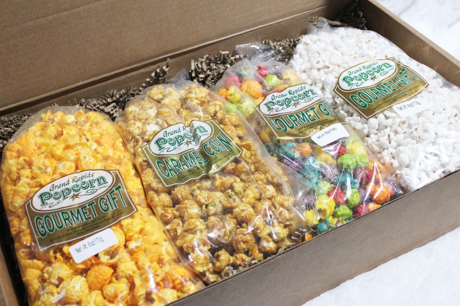 Can you believe the holidays are just around the corner? Typically the holiday season means spending time with friends and family, which means finding yourself at plenty of gatherings. One thing I was taught when I was younger was to never show up to someones home empty handed. I never know who will be inviting me over during the holidays, therefore I always make sure I have something I can easily grab and bring over. For me giving something Made in Michigan is very important to me, and that\’s why I am giving everyone Grand Rapids Popcorn this year. The Employee Favorite Box is $25.00 and comes with a bag of Cheddar Gold, Caramel Corn, White Salted and Monster Munch. The holidays are the perfect time to watch movies (hello Hallmark Channel) with friends and family which makes popcorn the perfect gift to give to anyone. What\’s your go-to gift?