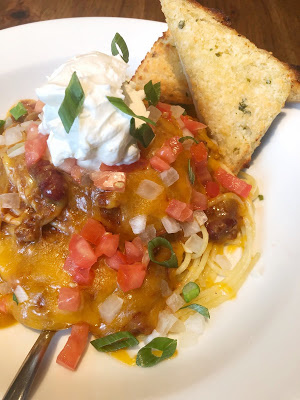 Spaghetti smothered with Rusty Bucket’s Texas sirloin chili and topped with cheddar cheese, sour cream, onion, and fresh diced tomatoes; served with garlic cheese bread