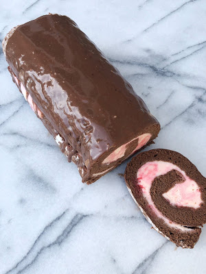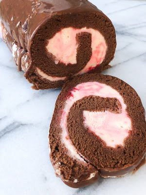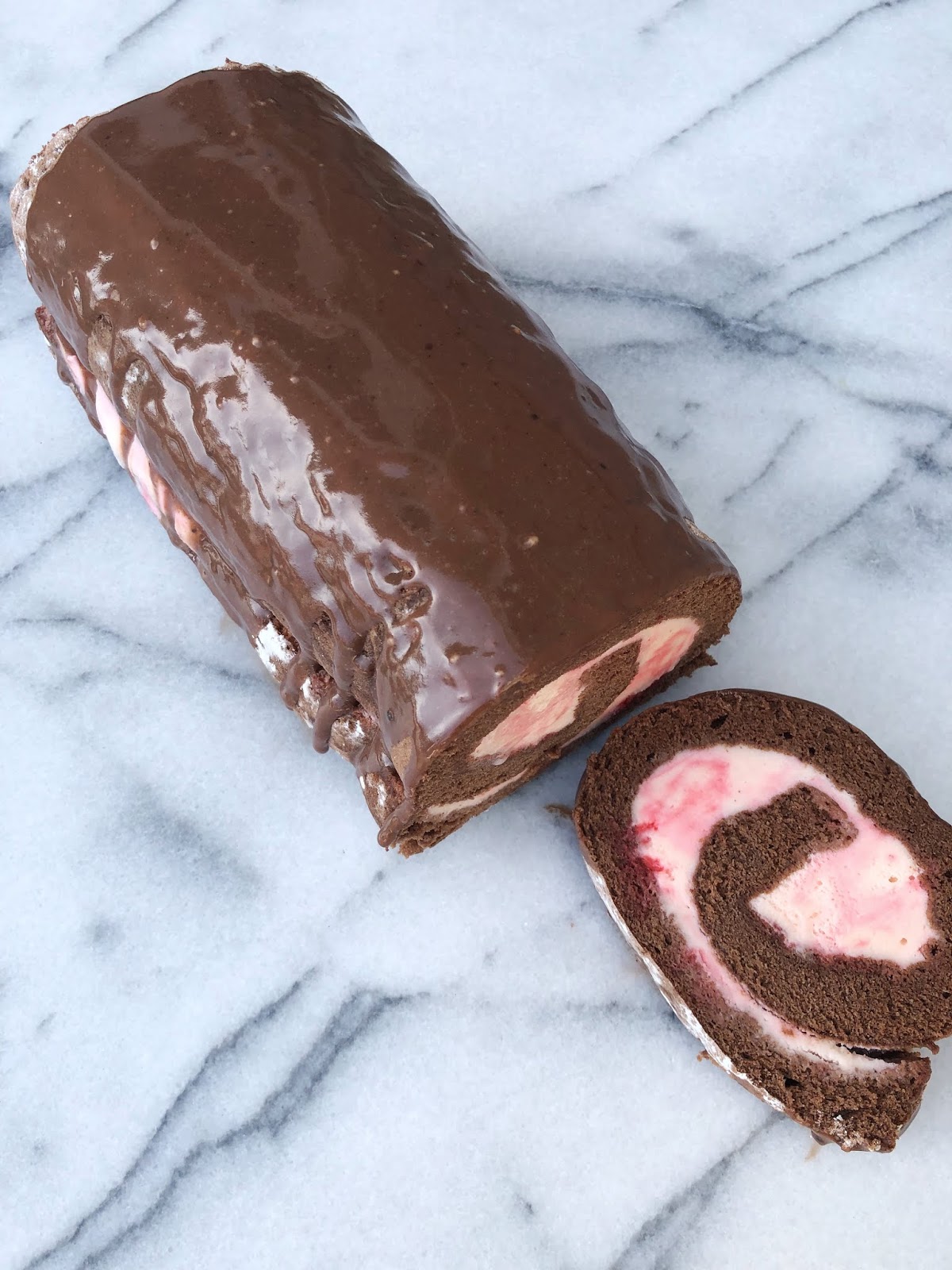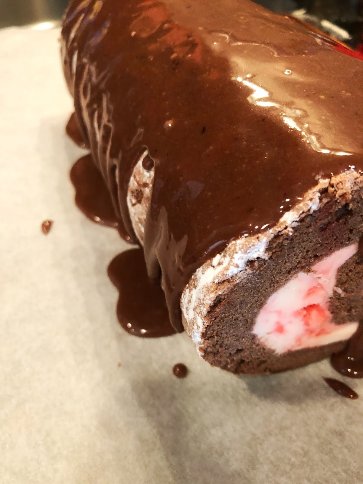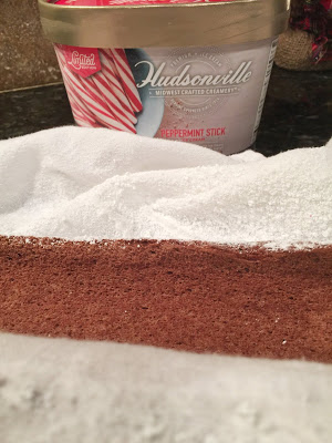 Impress your guests this holiday season with a homemade chocolate peppermint roll cake. No matter what your skill level in the kitchen is, you can easily make a roll cake. Trust me, this cake may look tricky to make – but it\’s actually really simple (we will keep that our little secret). Instead of using a traditional cake recipe, you will be making a sponge cake. I bet you\’re wondering what the difference between a regular cake and a sponge cake is, right? Well, a sponge cake is made up of flour, sugar, and eggs – no oil or butter. You\’ll want to cook the sponge cake in a jelly roll pan that has been lined with parchment paper. Once the sponge cake has finished cooking you will immediately turn the cake out onto a flour sack towel, that has been heavily coated in powder sugar (this will make sure it does not stick). You\’ll roll the cake up in the towel, starting at the short side. Then you will want to allow it to cool completely before you unroll it. Now let\’s talk about the filling, I used Hudsonville Peppermint Stick Ice Cream… because yum! You can use any ice cream that you desire though.