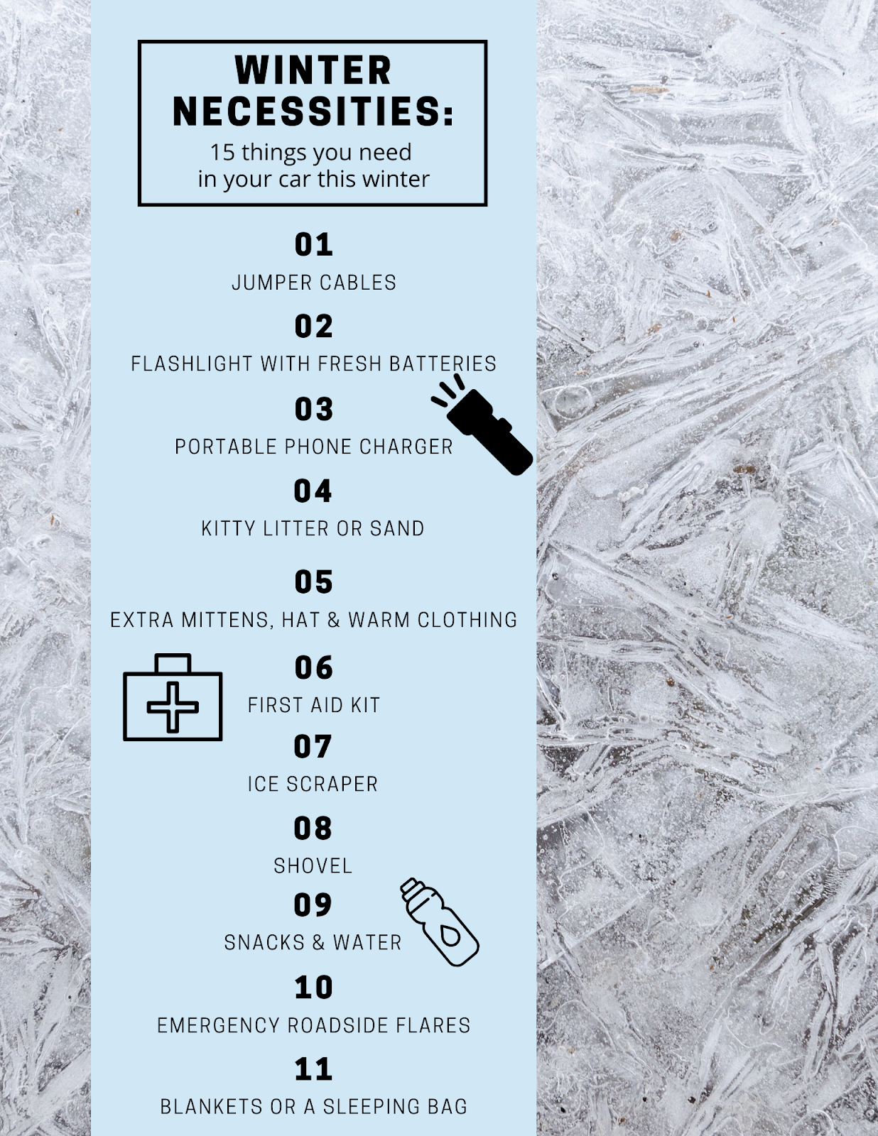 It’s beginning to look a lot like winter weather, every single day. Let’s face it, no one plans to slide off the road, get stuck in a snowbank or on the side of the road waiting for a tow truck in subzero temperatures. However, the reality of it, is this could happen to anyone of us and it’s better to be prepared then not prepared at all. Do you have a winter emergency kit in your car? If you don’t I highly recommend creating one! If you already have one, good for you! Just make sure you have these 11 items in it. Trust me, you’re going to want to keep this emergency kit stashed in the trunk of your vehicle for those just in case unexpected moments that life may throw at you.