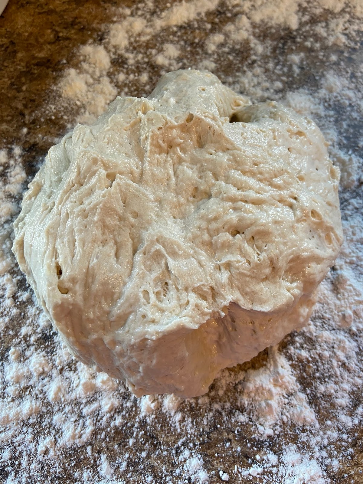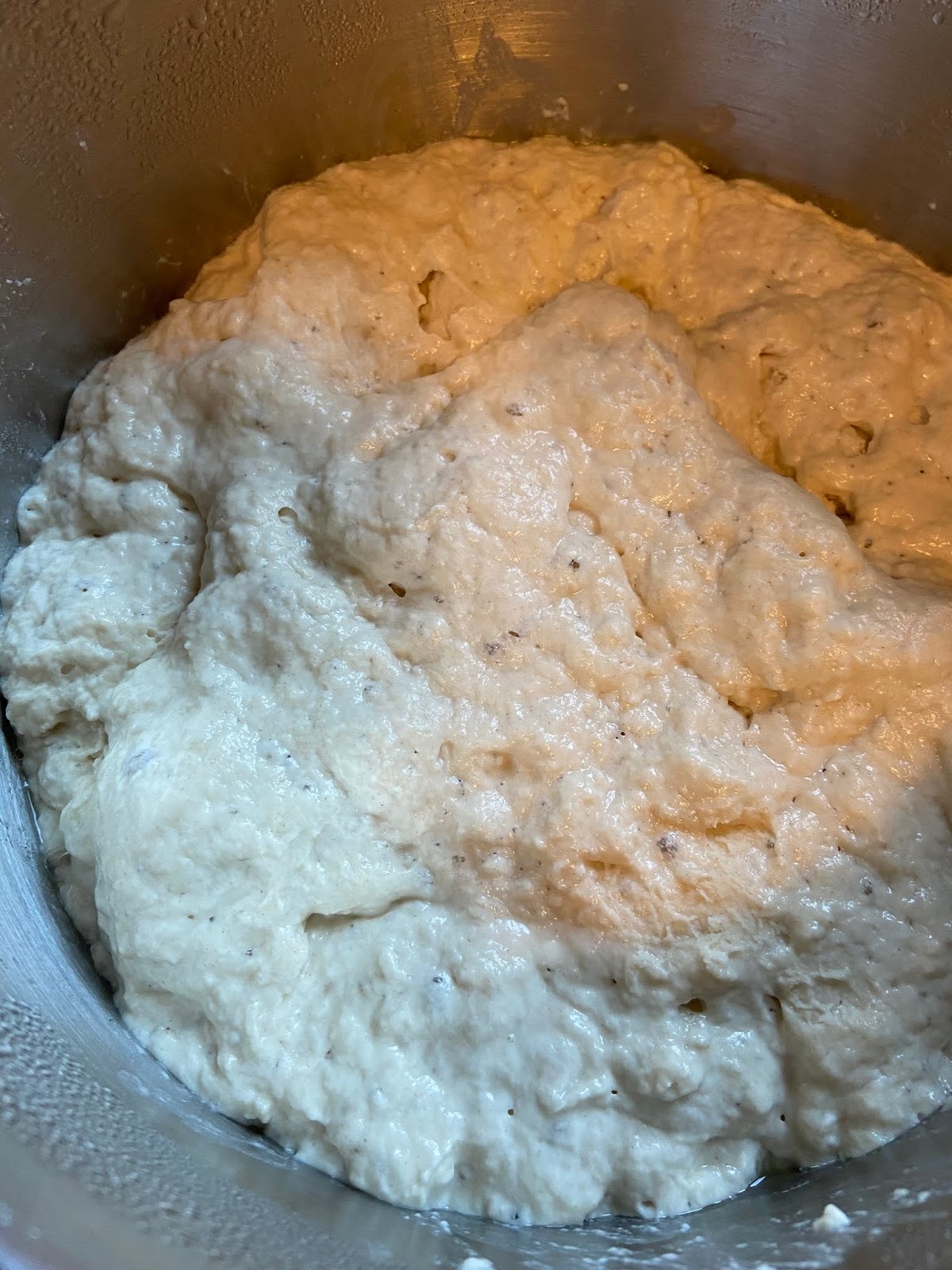 9. After the dough has risen for at least 12 but preferably 18 hours, it should look loose, moist, and have bubbles on the surface.