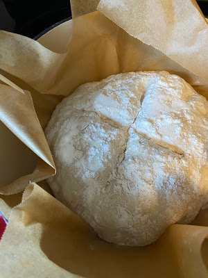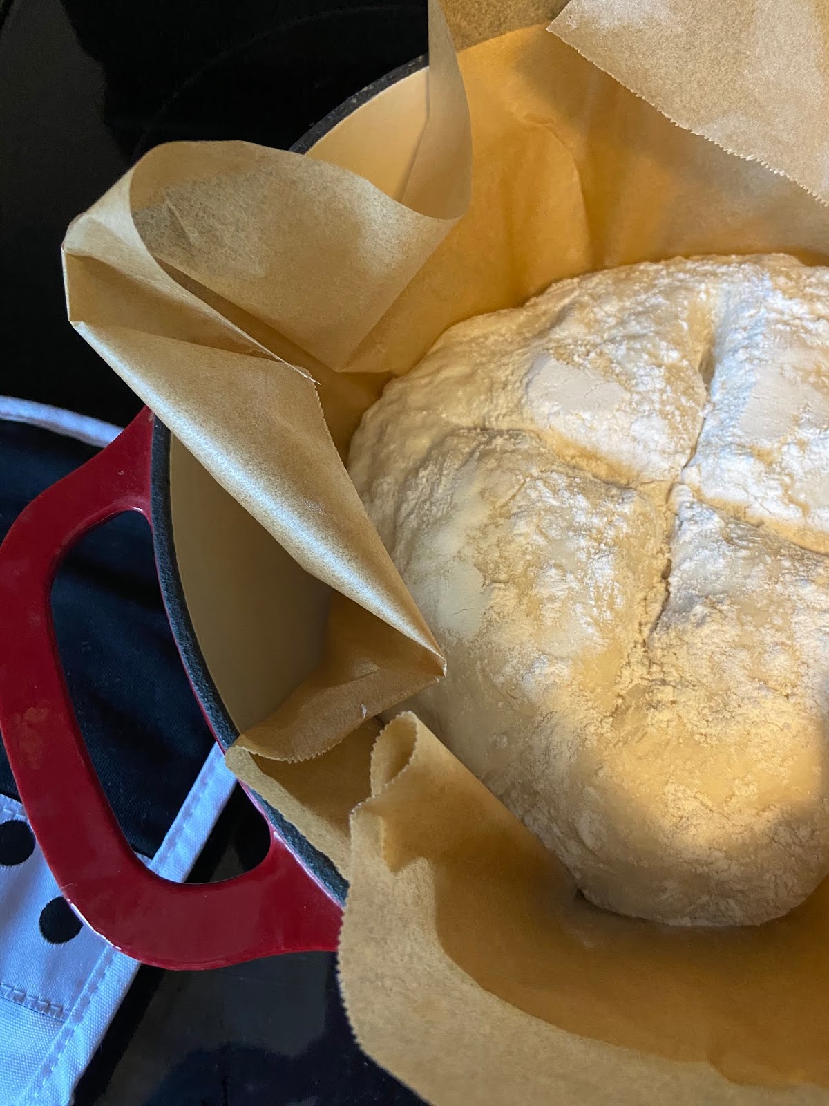 19. Remove the cover over the dough and place both the parchment paper and the dough into the heated pot – make sure the parchment lines the bottom.