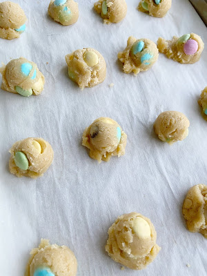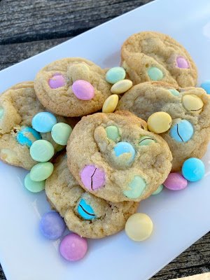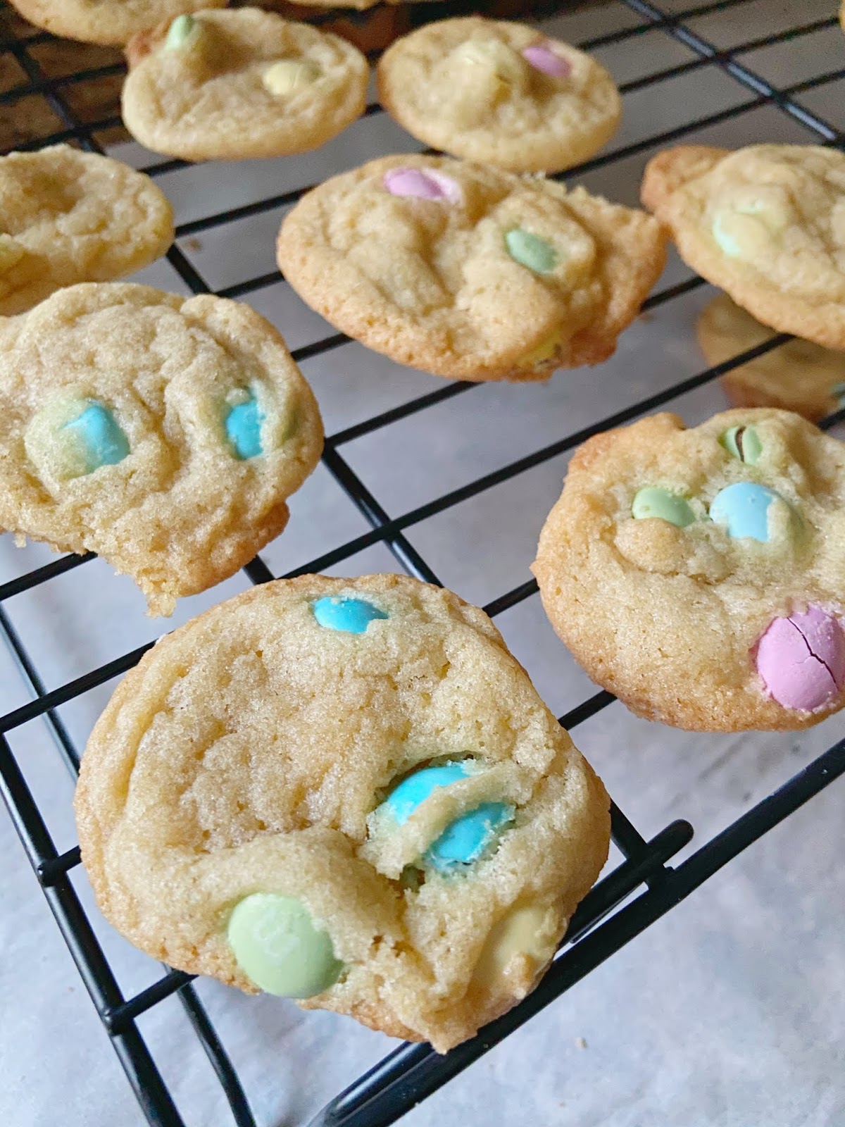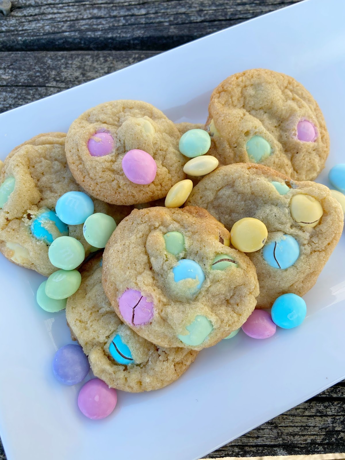 M&M\’s is always releasing special holiday colors, which makes these cookies perfect for any party or event. They\’d be perfect for any porch dropoff. Memorial Day is coming up, but since I haven\’t been able to find red, white and blue M&M\’s in stores yet, I decided to use some leftover pastel-colored M&M\’s that I had from Easter so I could share this amazing recipe with you.