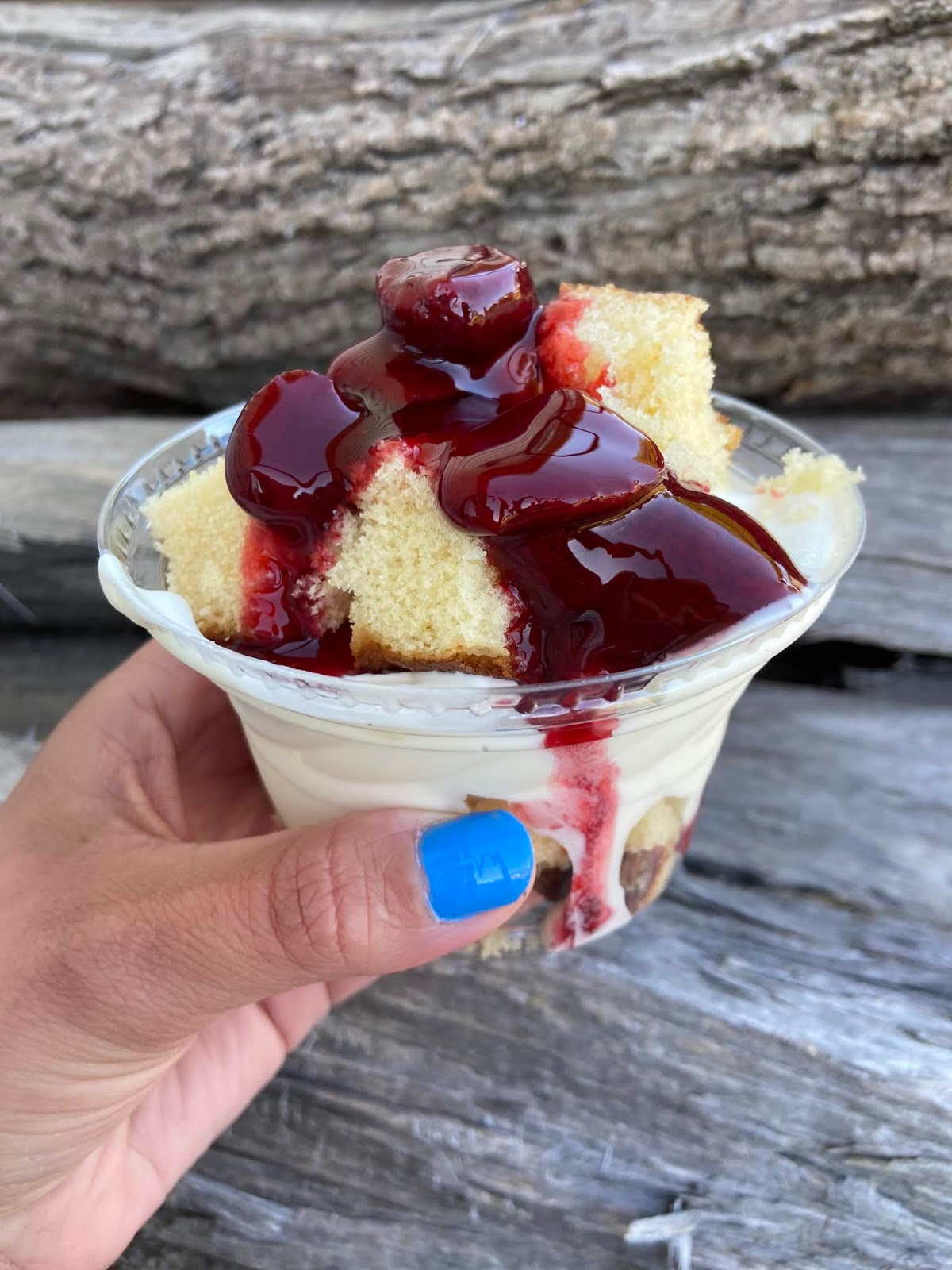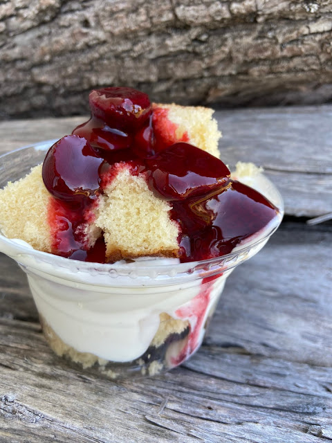 Erma\’s Frozen Custard DIY Strawberry Shortcake Kit came with a generous portion of vanilla ice cream, a slice of packaged SaraLee pound cake, and a container of delicious strawberry topping. I took the kit out on the trail with me, assembled it, and enjoyed it while I walked by the river.