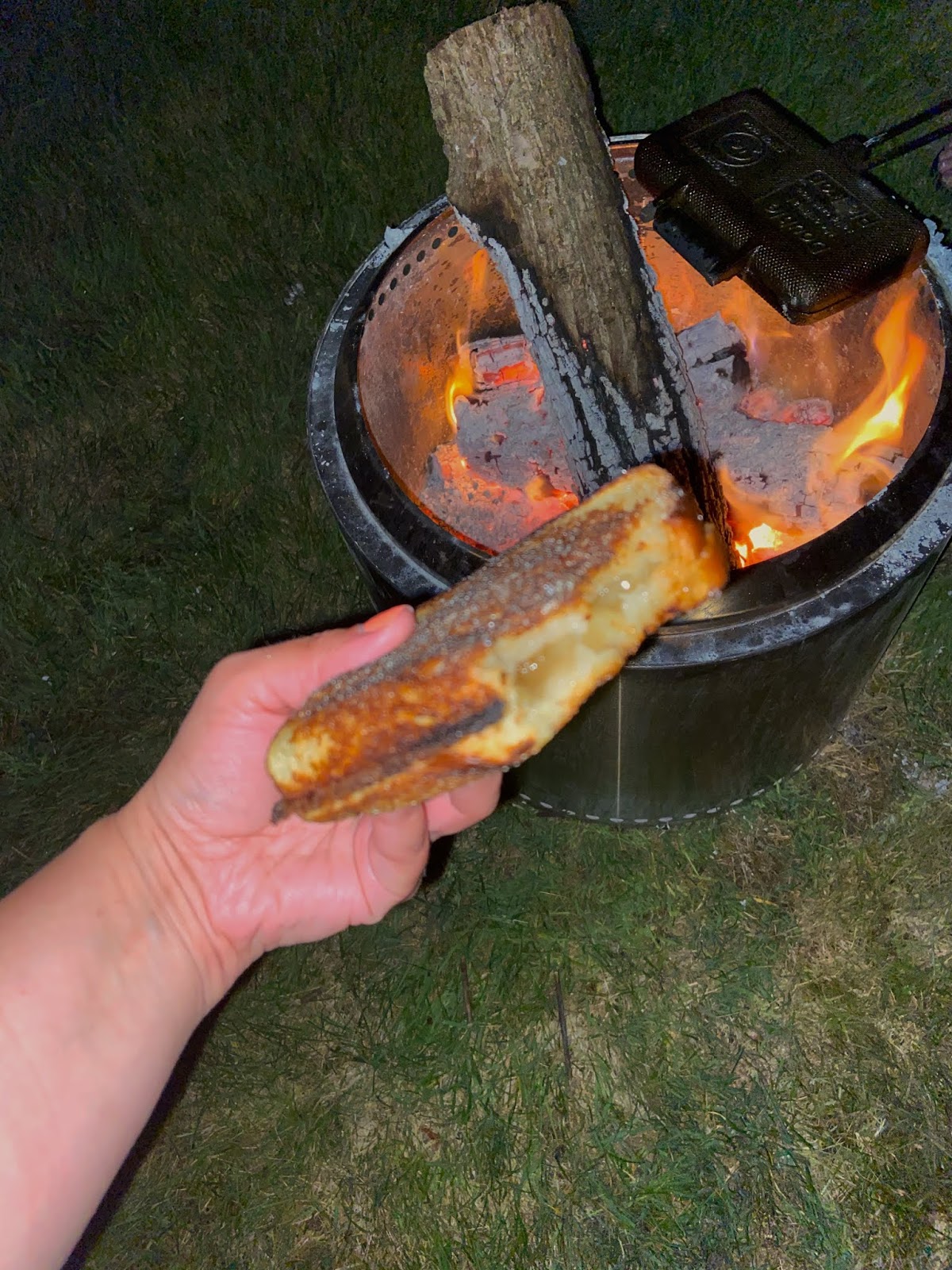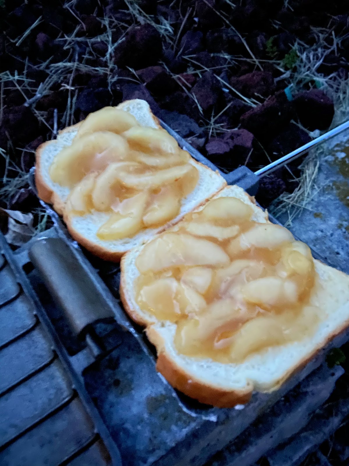 Campfire apple pie is insanely simple and affordable to make. All you need is bread, a can of apple pie filling, butter, and a pie iron.