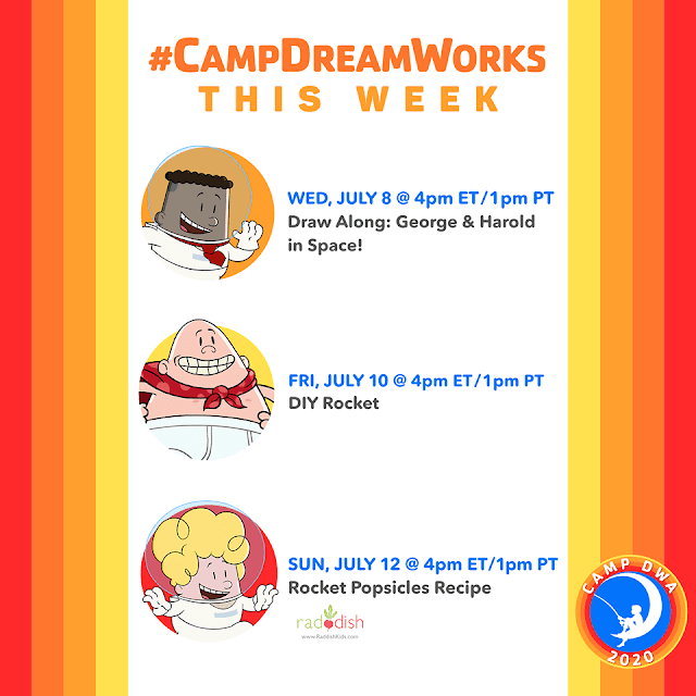 Hello, campers! Are you ready for week three of #CampDreamWorks? This week Captain Underpants is taking over camp, and bringing you a draw along, a DIY rocket project, and a rocket popsicle recipe from Raddish – I am loving the Raddish recipes!