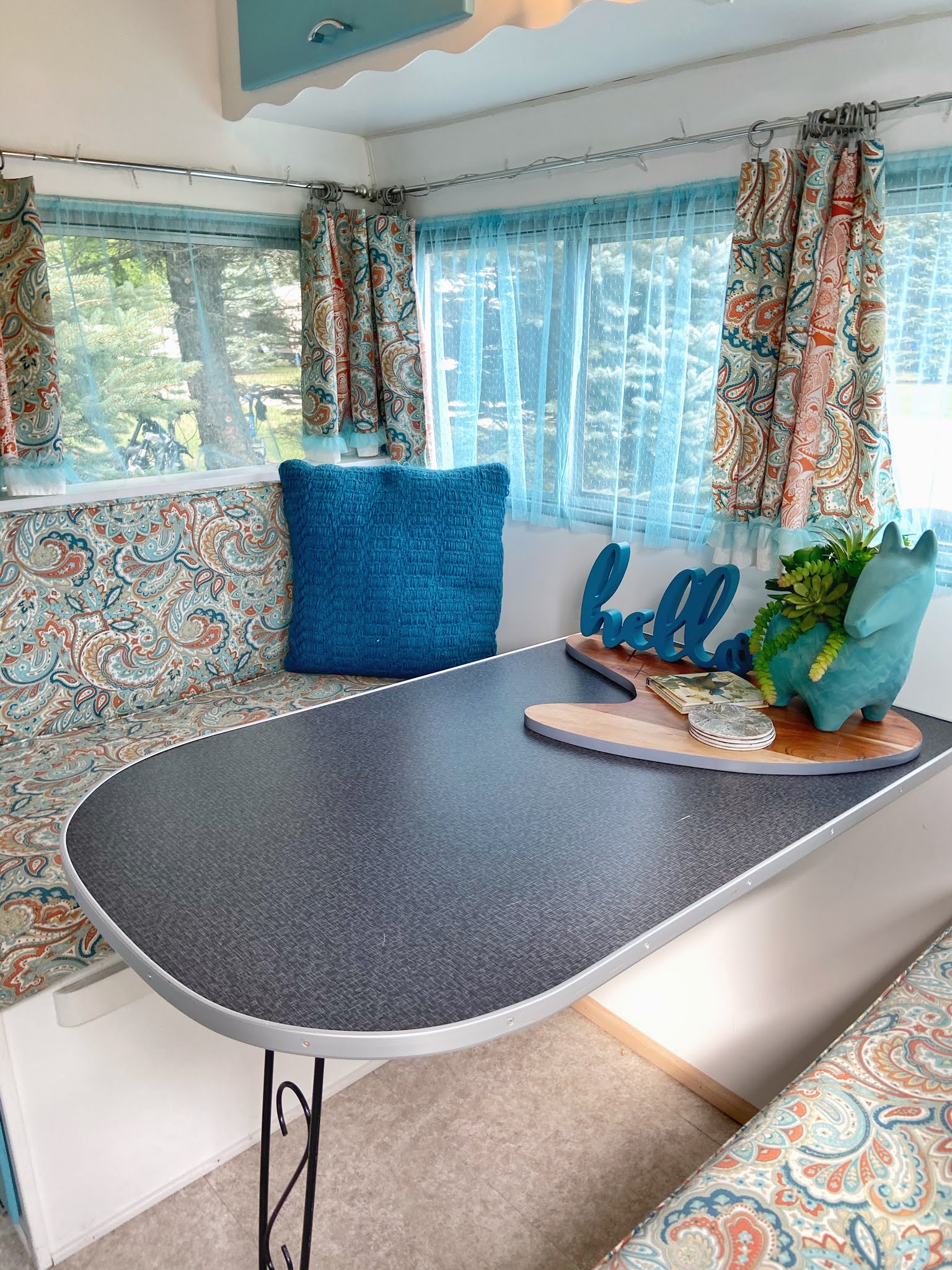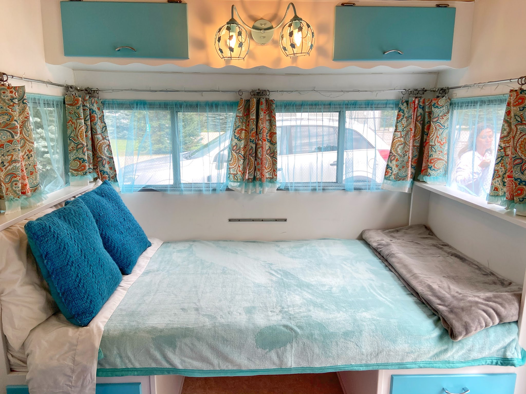 The camper features a bed at the back of the camper and there can be a second bed at the front when you convert the dining table to a sleeping area. The beds have the softest blankets!