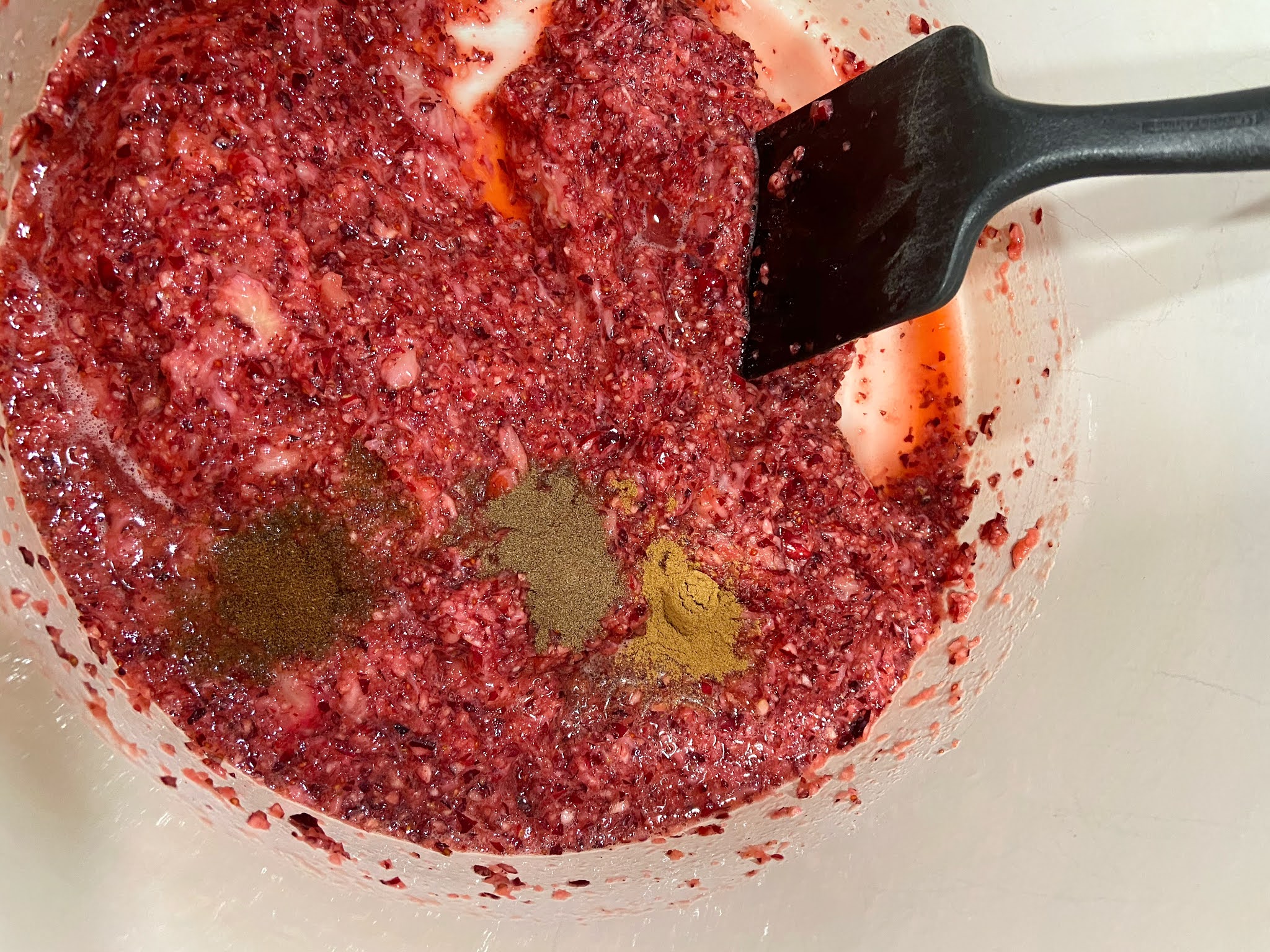 6. To a stockpot add your smashed strawberries, cranberries, and spices – stir.