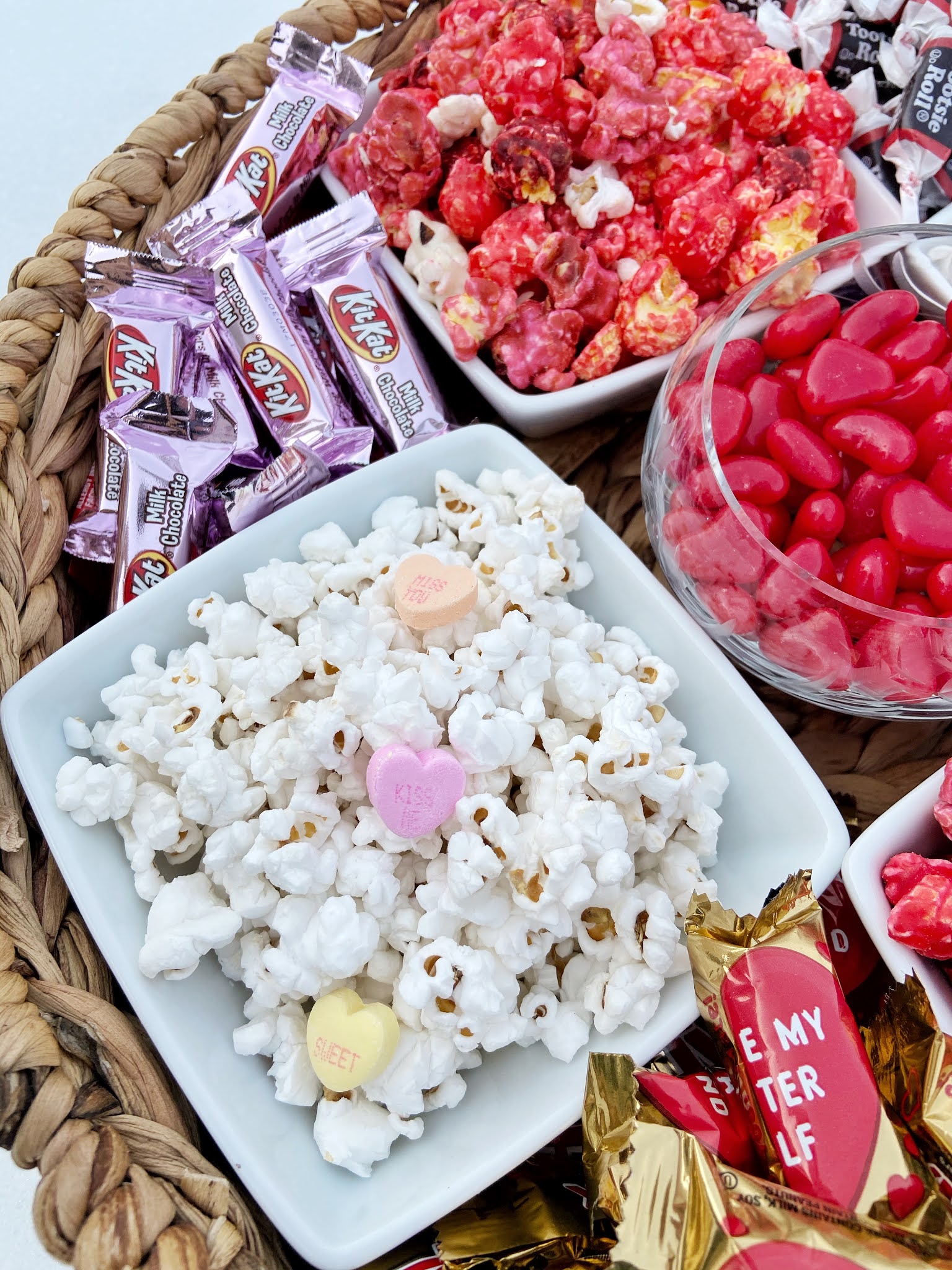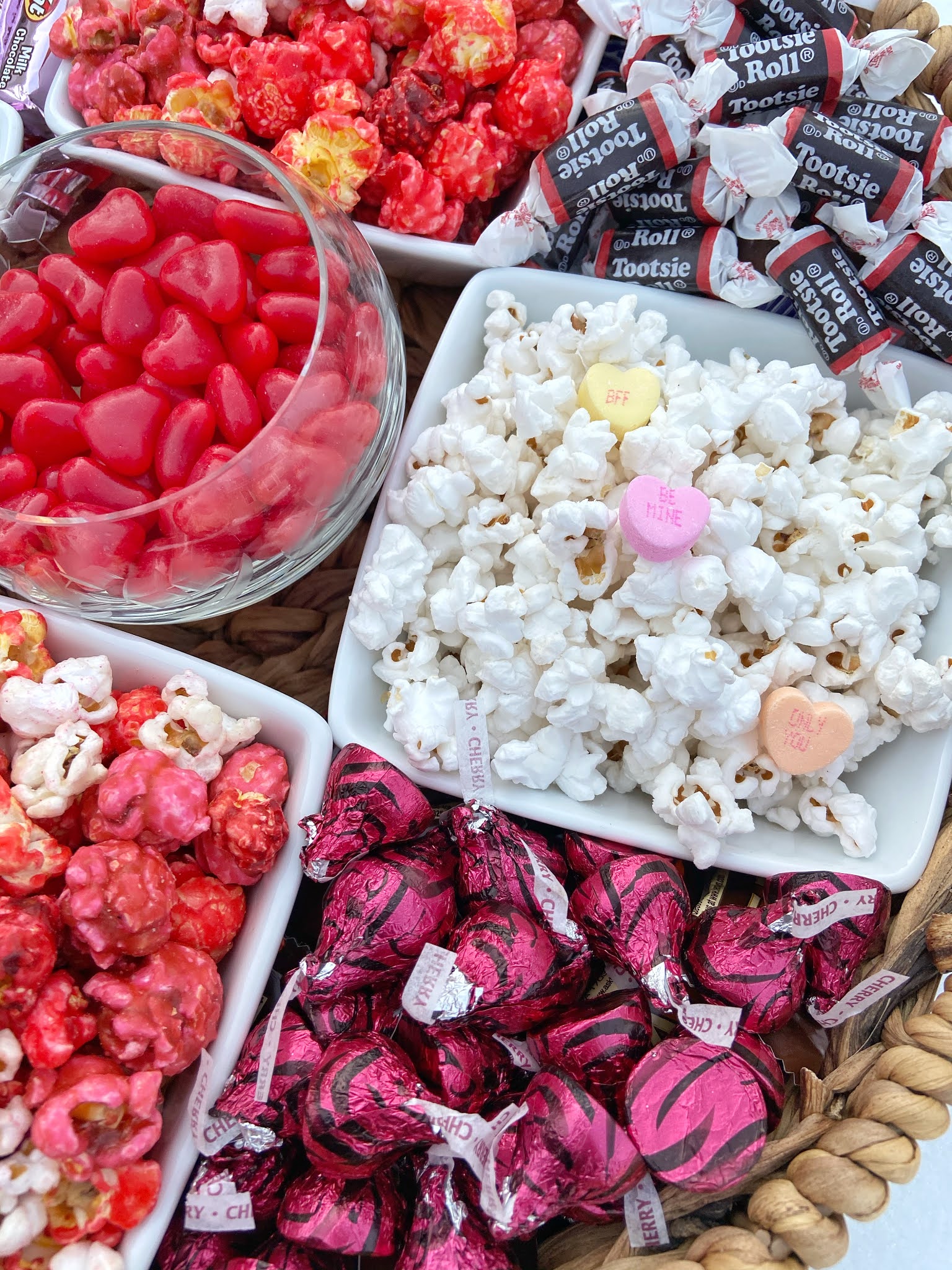 I love the nostalgia that traditional assets create, but I also like to spice it up with a little something unexpected as well. Instead of a big dish of candy hearts, I adorned the popcorn with it, and also added some beautiful Sweetheart popcorn from Grand Rapids Popcorn company for visual aesthetics. I mixed common shapes, flavors, and textures together to bring a sense of whimsy to the board.
