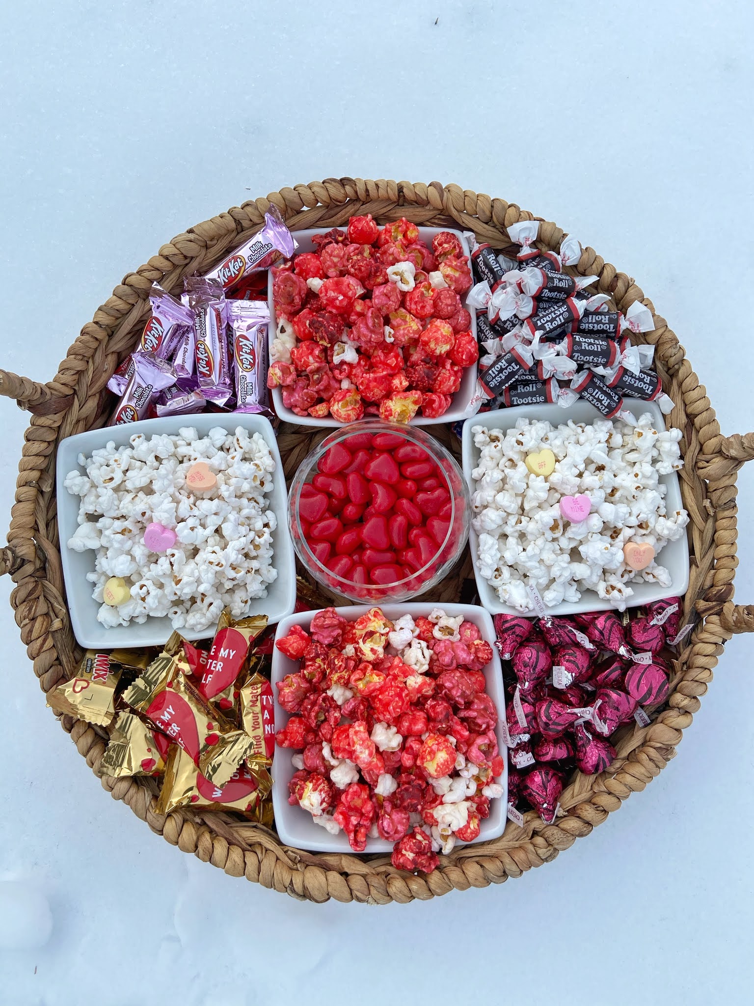 Figuring out the placement for everything on your Valentine\’s Day candy board can get a bit overwhelming. Use dishes to puts sweets in instead of just having them lay directly on the board. Start with your biggest thing in the center or off-center of the board. From there work your way around the board adding all your elements. There is no wrong way to create a Valentine\’s Day candy board, so just have fun.